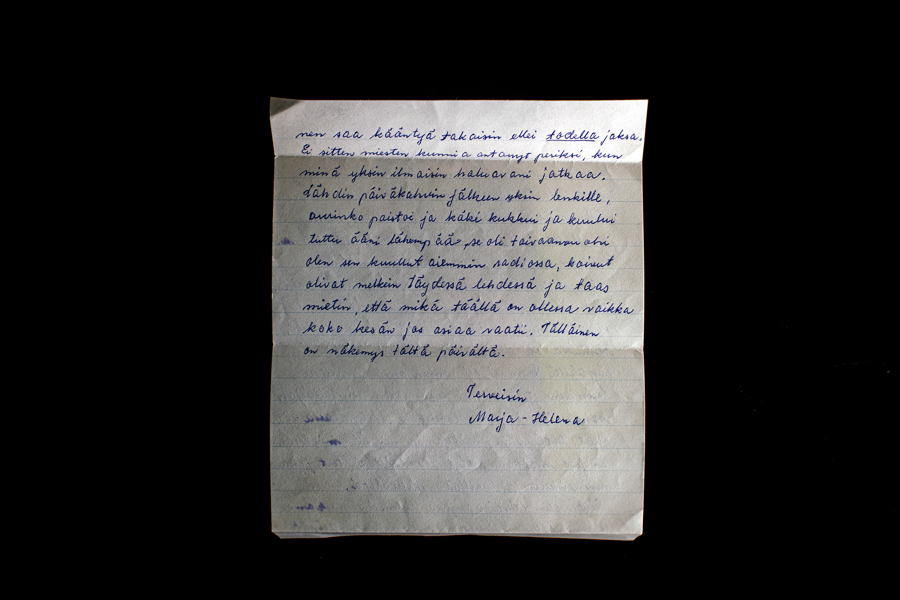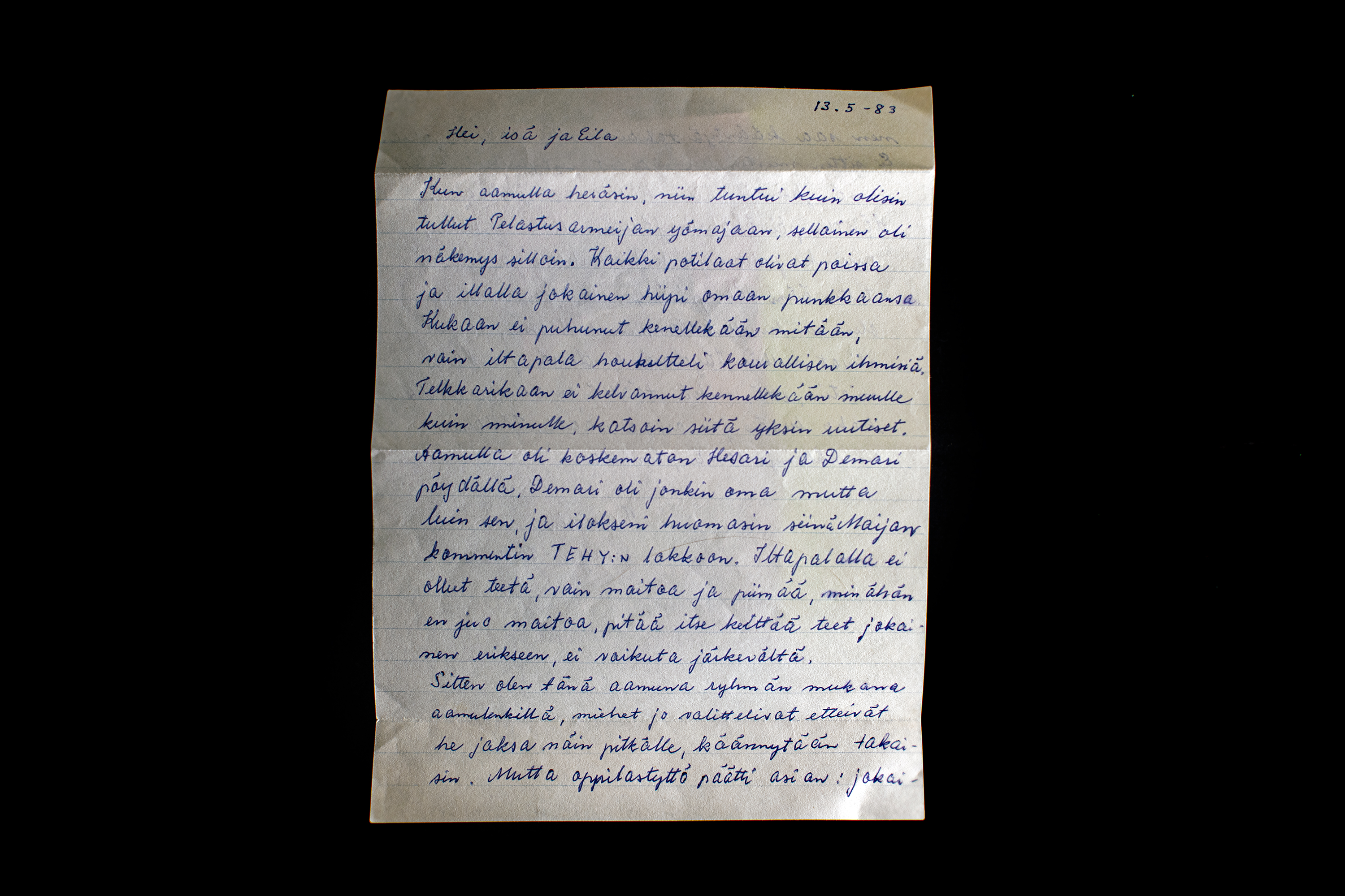 kun aamulla heräsin, tuntui kuin olisin tullut Pelastusarmeijan yömajaan, sellainen oli näkemys silloin. Kaikki potilaat olivat poissa ja illalla jokainen hiipi omaan punkkaansa. Kukaan ei puhunut kenellekään mitään, vain iltapala houkutteli kourallisen ihmisiä. Telkkarikaan ei kelvannut kellekään muulle kuin minulle, katsoin siitä yksin uutiset. Aamulla oli koskematon Hesari ja Demari pöydällä. Demari oli jonkun oma mutta luin sen, ja ilokseni huomasin siinä Maijan kommentin Tehyn lakkoon. Iltapalalla ei ollut teetä, vain maitoa ja piimää. Minähän en juo maitoa, pitää itse keittää teet jokainen erikseen, ei vaikuta järkevältä.