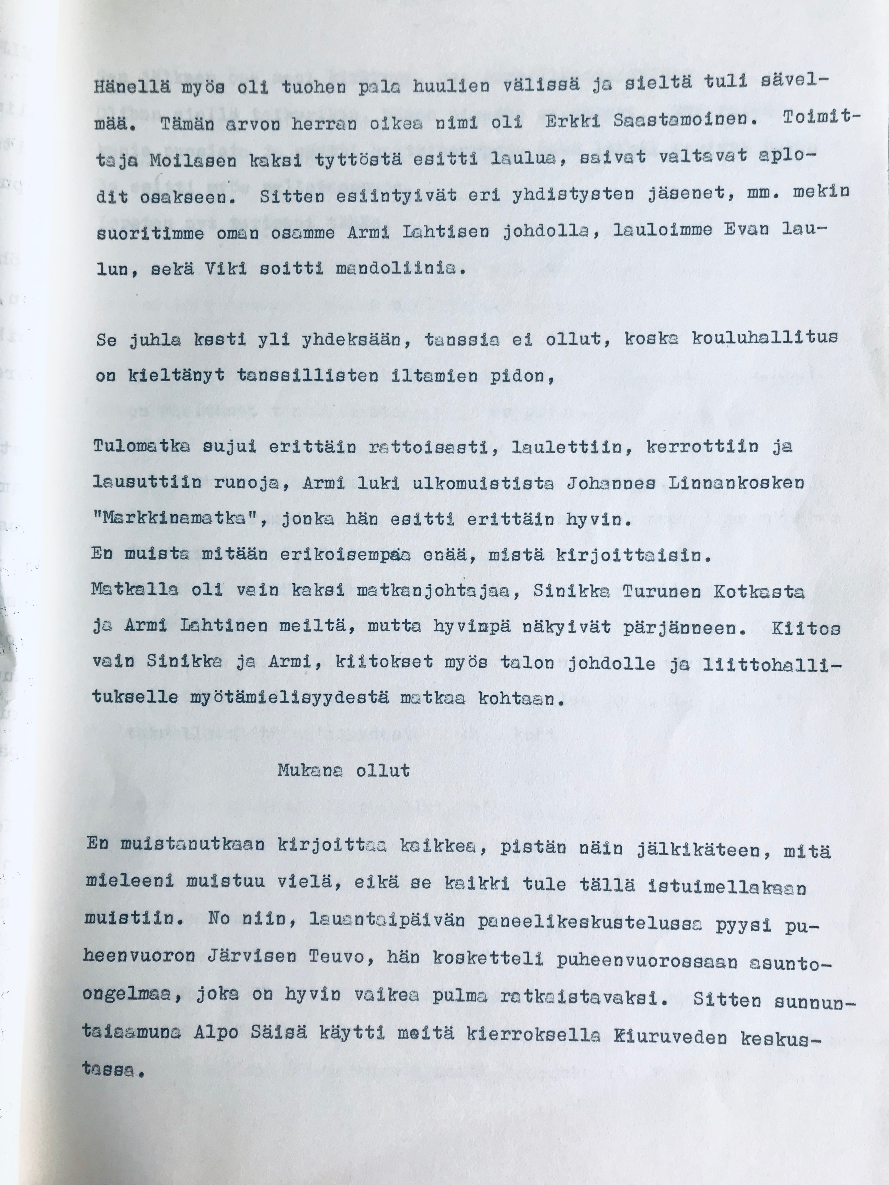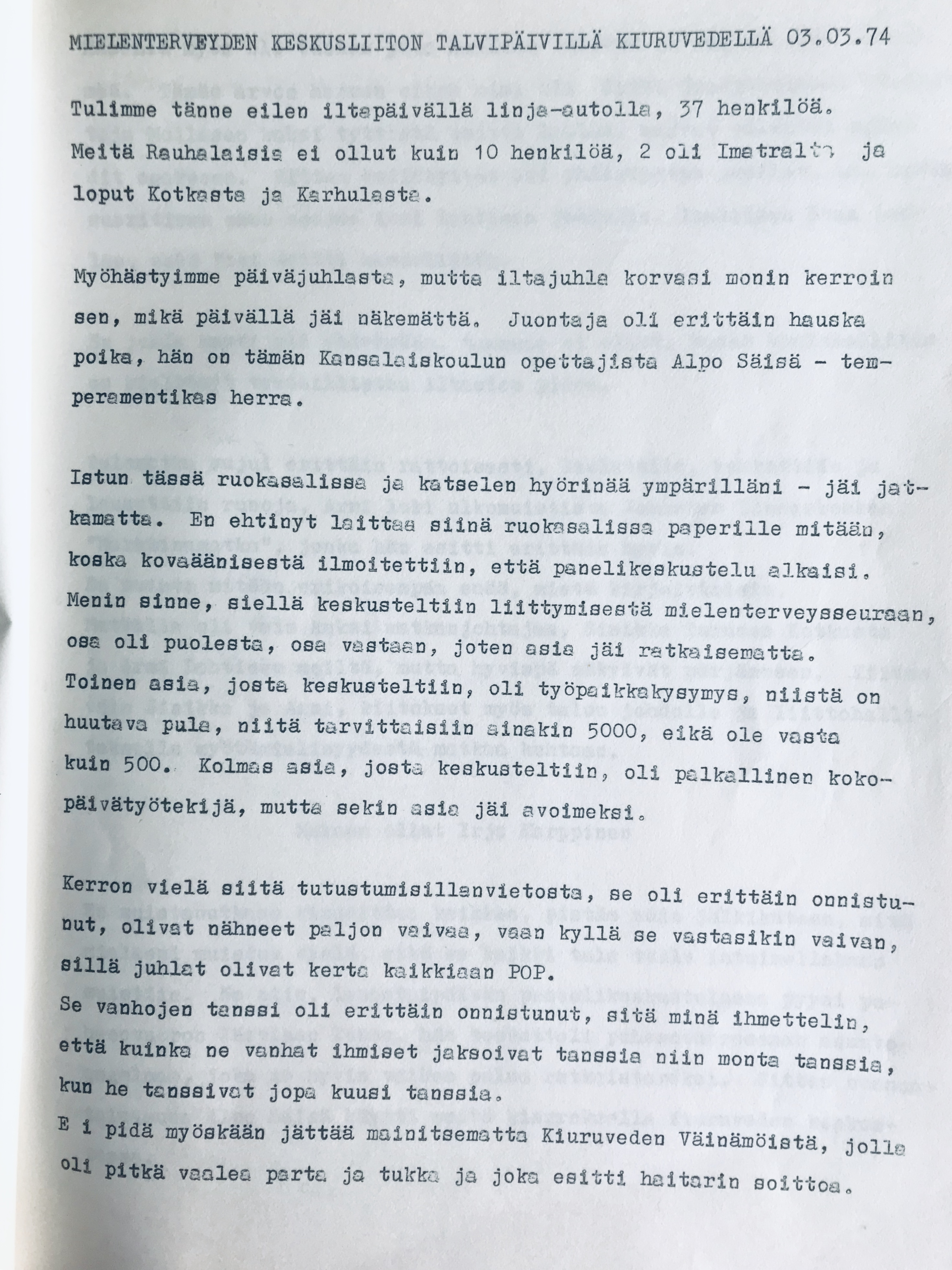 Irma osallistui aktiivisesti potilasyhdistykseen, jonka toiminta Rauhassa alkoi vuonna 1969. Hän toimi puuhanaisena muun muassa yhdistyksen tansseissa. Alla olevan tekstin Irma kirjoitti sairaalan henkilöstölehteen vuonna 1974.